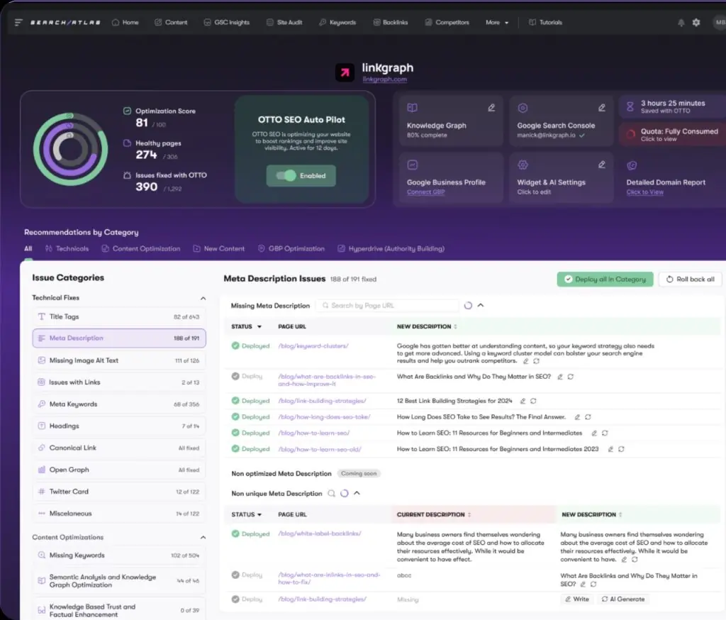 OTTO includes AI-driven content analysis and optimization suggestions, including title tag and meta description generation.