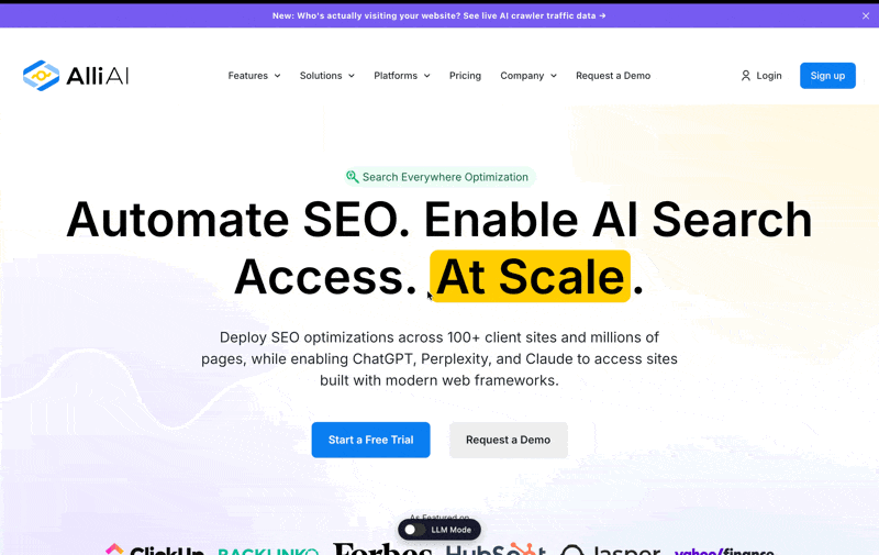 We added a toggle to the Alli AI homepage called LLM Mode. Flip it off, and you see the site the way a human does: styled, branded, rendered. Flip it on, and you see what an AI crawler receives: structured markdown. Navigation as plain-text links with full URLs. Headlines as hierarchy markers. Images reduced to alt text and source paths. Content stripped to its information architecture with no styling, no layout, no visual rendering.