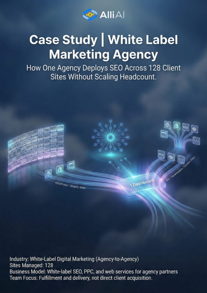 How a white label marketing agency eliminated the manual SEO deployment bottleneck across 128 client sites on WordPress, Shopify, Wix, Squarespace, and custom builds, growing their portfolio 60% without adding headcount.